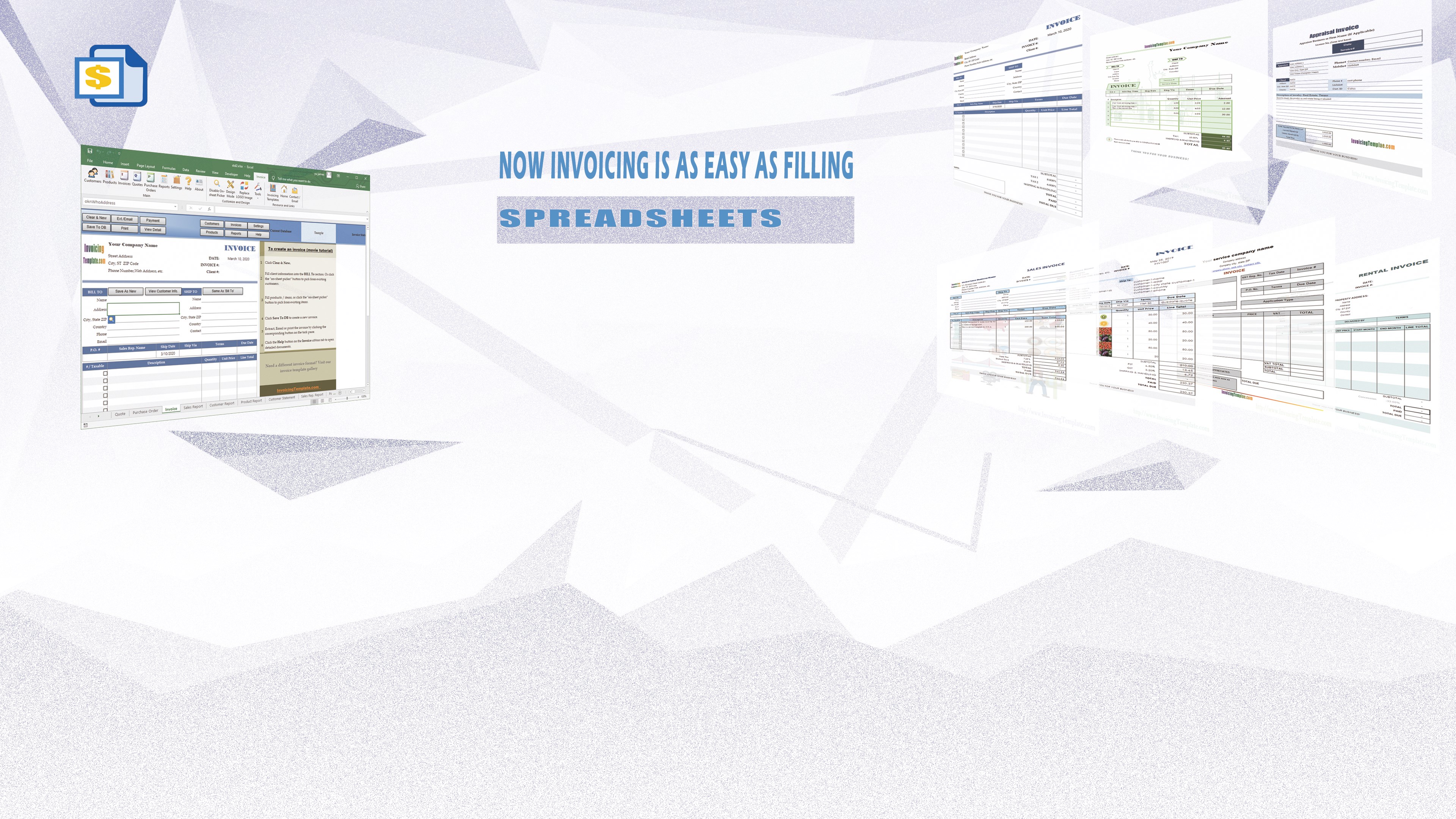 Invoicing software and billing software for small-scale businesses. Generate cute invoices with Microsoft Excel invoice templates. Unlike those circuitous invoice systems, our free invoice templates in Excel spreadsheet format provide intuitive what-you-see-is-what-y'all-get invoice creator — processing invoices are as elementary every bit filling spreadsheets. Different pure Excel templates, this invoice generator connects the template with databases, making information technology easier for pocket-sized business owners to get reports like accounts payable and product sales. The invoicing app installs only one template. Small businesses demand professional person invoices too, then we designed free templates for different business and industry types, suitable for both sales and service businesses, such every bit consulting, cross-board proforma/commercial, VAT or sales tax, sole trader or freelancer, garage/car repair, subcontract/agriculture, freight, clothing shop/manufacturer, time billing / hourly invoicing, legal/attorney/police business firm, rental, medical/psychologist, pet sitting, contractor, designer, photography, labor, construction, pest control, hotel/motel, and many more. Best of all, all the templates are open source — i.e. not locked with passwords, and so yous can further customize past using all the rich tools provided by Microsoft Excel/Office, such as modifying fonts and colors, moving cells, using formulas and drop-downward lists, or fifty-fifty applying VBA macros. It is a simple invoice creator software, but includes all the fundamental invoice management features, for instance: manage customers/clients, convert quotations to invoice, create and e-mail buy orders, generate PDF or image invoices, print on letterhead paper, track payments. Besides the default Microsoft Admission database format, the invoicing app too supports the online SQL Server database. This invoice maker app requires the desktop version of Microsoft Excel. It does not work with the web version of Office (i.e. Office online that runs within a spider web browser). The trial version is fully functional. After the trial period, you'll need to subscribe to proceed it.